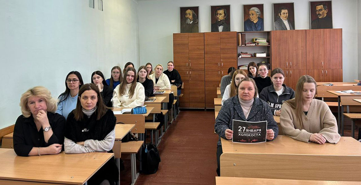 На факультете начального и музыкального образования прошел информационный час, посвященный Международному дню памяти жертв Холокоста. Его провела заместитель декана по идеологической и воспитательной работе Ю. В. Аленькова. Она напомнила студентам об освобождении советскими войсками крупнейшего лагеря смерти Освенцим (Аушвиц-Биркенау) 27 января 1945 г., о масштабах уничтожения мирного населения нацистами.